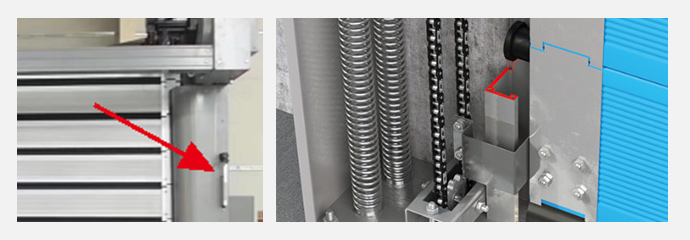 硬質(zhì)快速門整體外觀;采用寶鋼鍍鋅板經(jīng)激光切割、數(shù)控折彎而成的成型的渦輪系統(tǒng)、導軌系統(tǒng)、防護外罩,長久不生銹,外部美觀、防塵、輕松清潔傳動系統(tǒng);一體式的傳動系統(tǒng),使得門體兩側(cè)均勻受力,整體運行通暢。